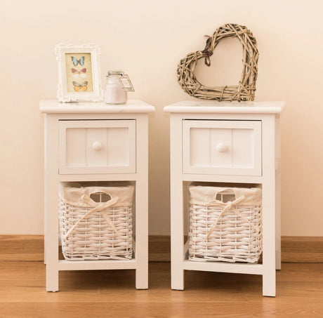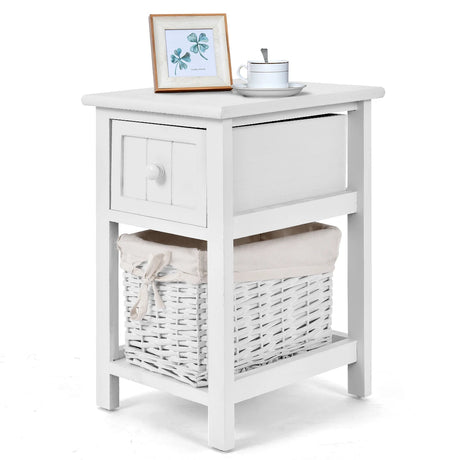 2 Tiers Wood Nightstand with 1 Drawer and 1 Baskets for Home-White