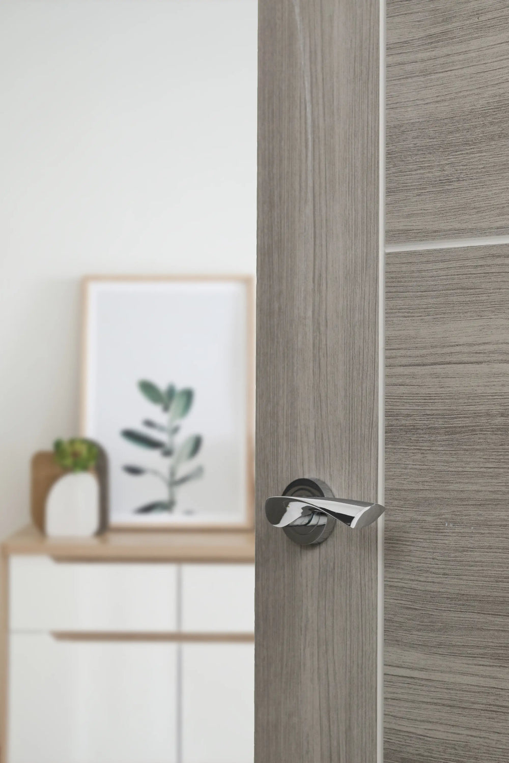 Eco Aqua Aluminium Lever Door Handle on Round Rose - Polished Chrome - Set is backordered and will ship as soon as it is back in stock.