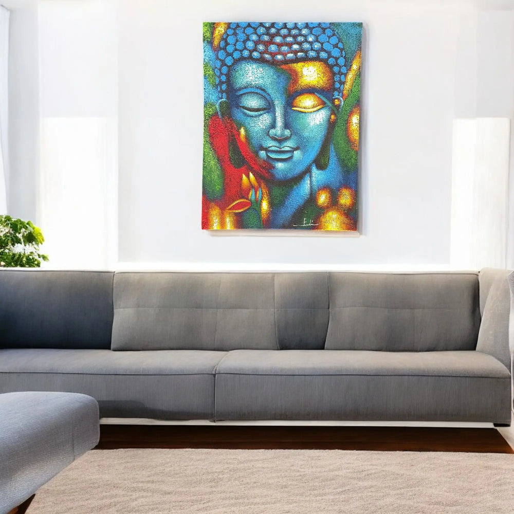 Infuse any space with vibrant energy and spiritual calm through this striking Buddha Painting. Featuring a radiant mix of blue and gold hues, the Buddha’s peaceful face exudes serenity, while the glowing gold flower adds a touch of warmth and brilliance. At 75x55 cm, this eye-catching artwork is perfect for meditation spaces, yoga studios, or as a bold statement in any room seeking an artistic connection to mindfulness.
