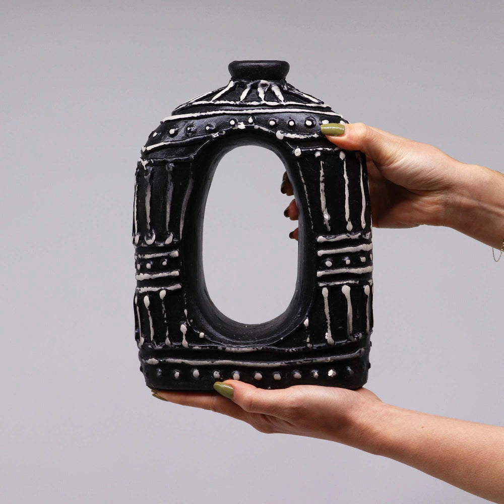 This ceramic vase is a harmonious blend of tradition and artistic craftsmanship, making it a remarkable addition to your interior decor. The exclusive oval donut shape adds a unique twist to the traditional vase design, ensuring it stands out as an exquisite centrepiece that draws attention and admiration. The rich chocolate hue of this vase exudes warmth and depth, offering a distinctive alternative to the conventional colour palette. It's the perfect choice for infusing character and personality into your living space.