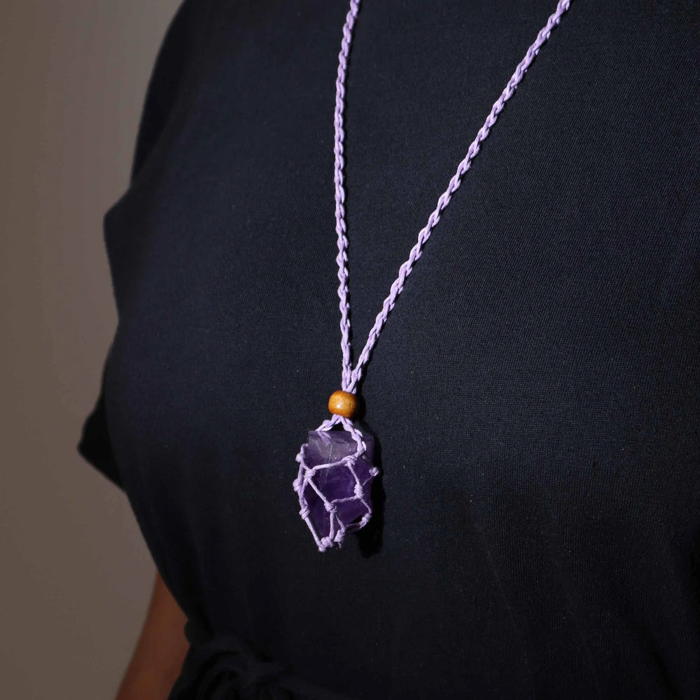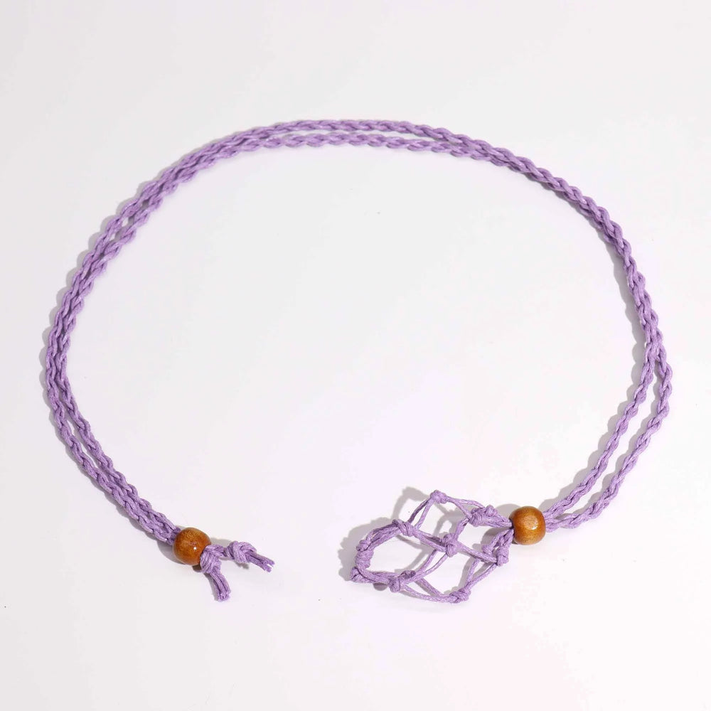 This purple necklace cord is a versatile and stylish option for your customers' jewellery designs. The adjustable length ensures a perfect fit for any wearer, accommodating various necklines and personal preferences. The cord's vibrant purple hue complements a wide range of gemstone colours, from vibrant to muted. The intricate macrame netting securely holds the crystal, creating a unique and eye-catching display, as seen in the image.