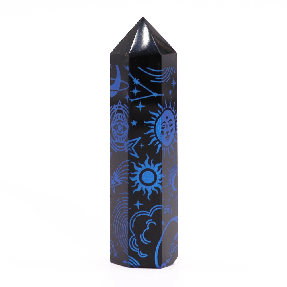 Black Obsidian Points, meticulously crafted and adorned with mystical midnight blue designs. Each point weighs approximately 60-70 grams and stands 9 cm tall, making it the perfect size for a variety of uses, from energy cleansing to meditation.