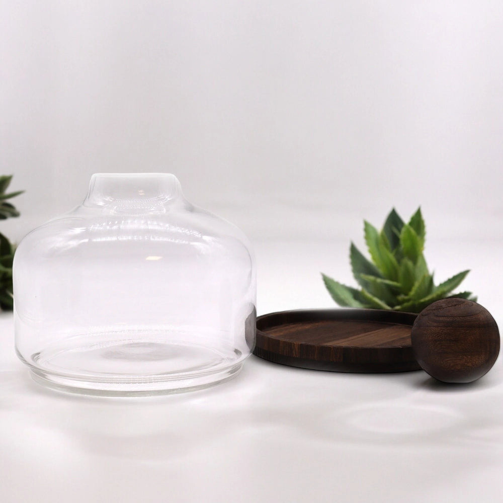 The dark tung wood base elevates the terrarium's aesthetic, setting it apart from terrariums with lighter wood or plain glass bases. The deep, sophisticated tone complements a variety of plants and decorative elements, making it a versatile piece that caters to a wide range of design preferences.