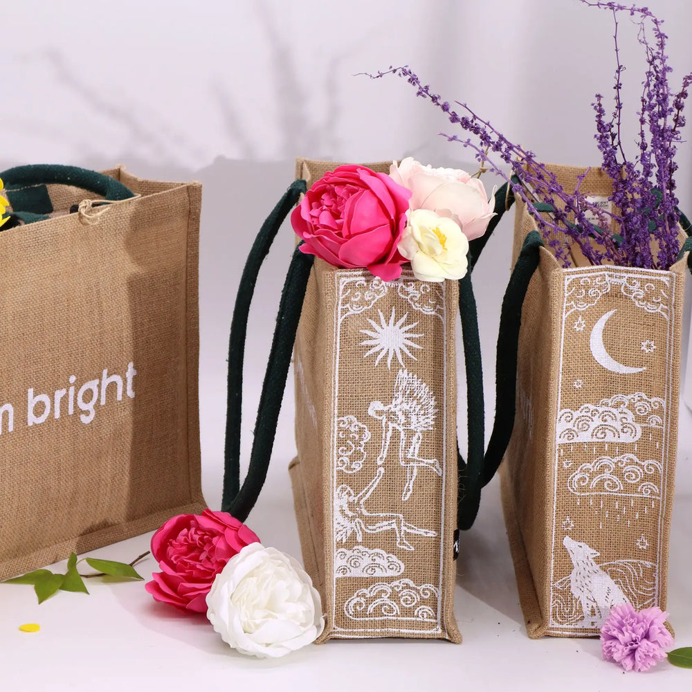 Crafted from sustainable jute fibres, our bags are not only environmentally conscious but also durable ( thanks to a thin layer of biodegradable Polypropylene (PP) lamination ).