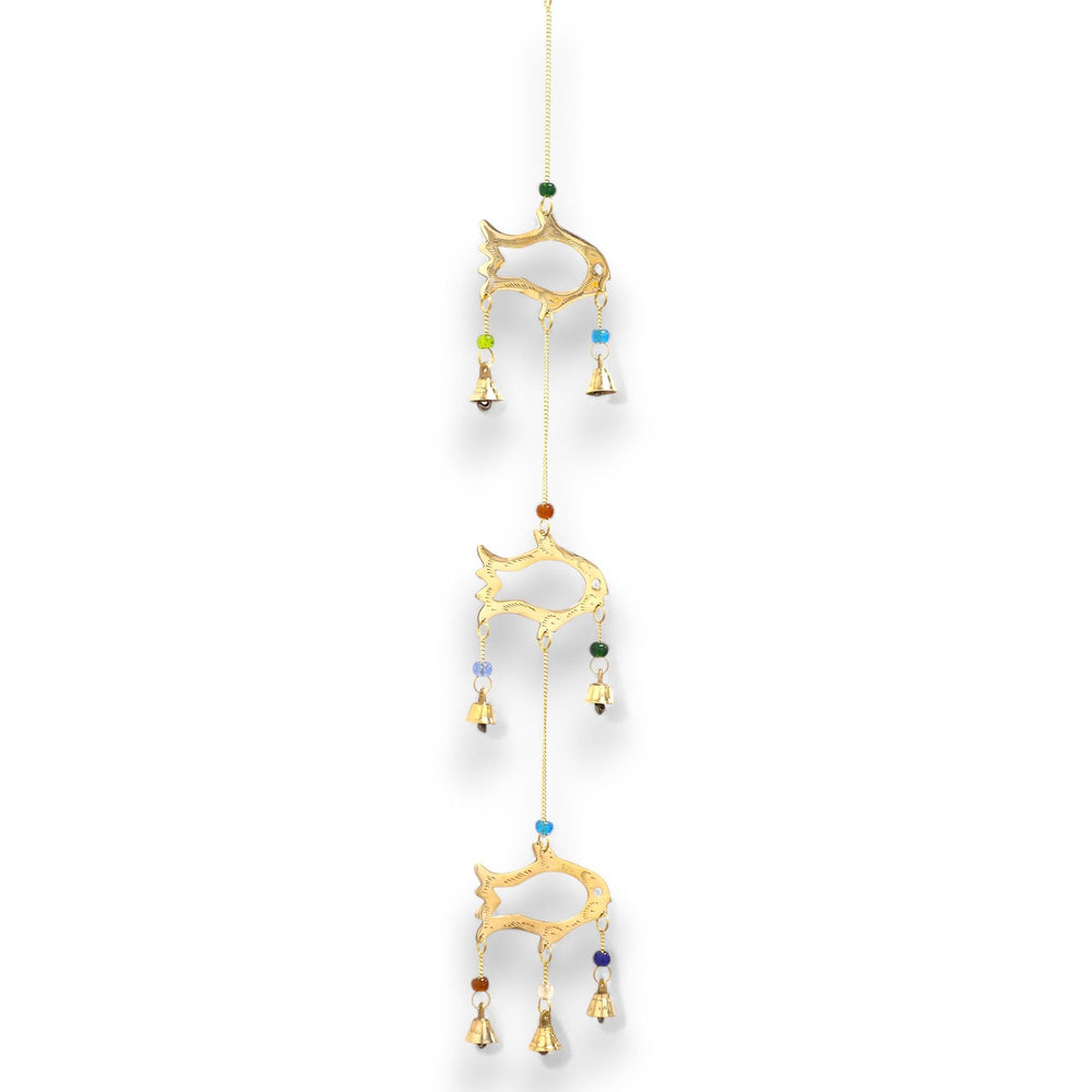 This 54 cm chime features three brass fish shapes, suspended along with colourful beads and 7 brass bells that produce soothing, melodic tones with the breeze.