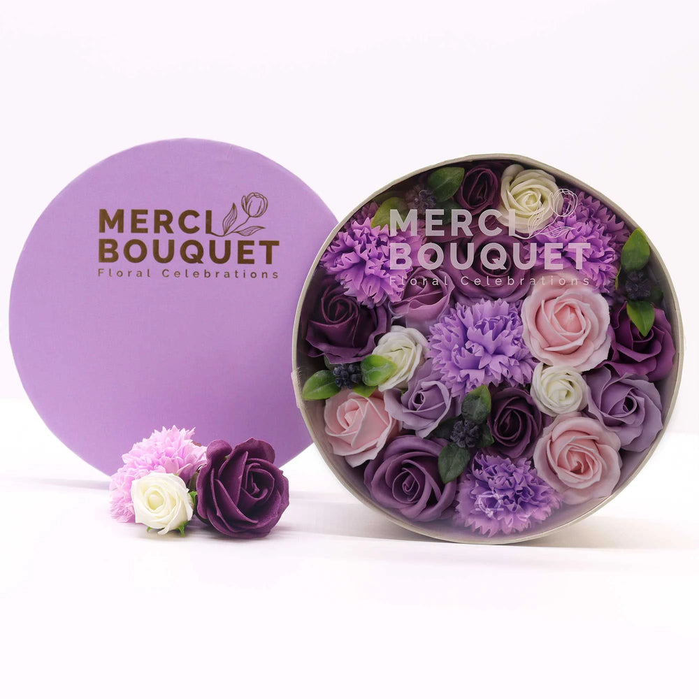 Spoil your customers with the opulence of purple and the beauty of roses and carnations. Our Soap Flower Gift Round Box in Purple Rose & Carnation is a statement of refined taste and affection.