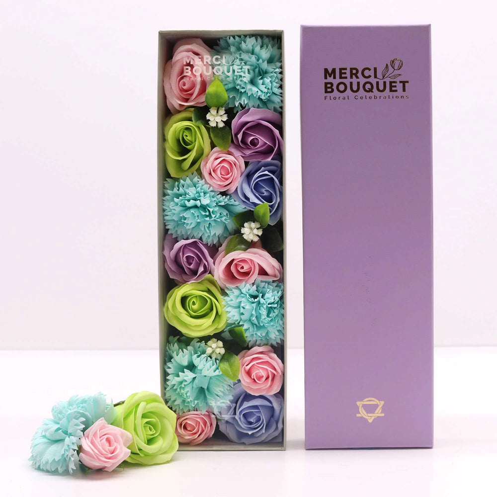 Exquisite Soap Flowers Long Box in the enchanting "Baby Blessings - Blues" collection. These delicate petals are a symphony of soothing blue hues, designed to captivate both the eyes and the senses.