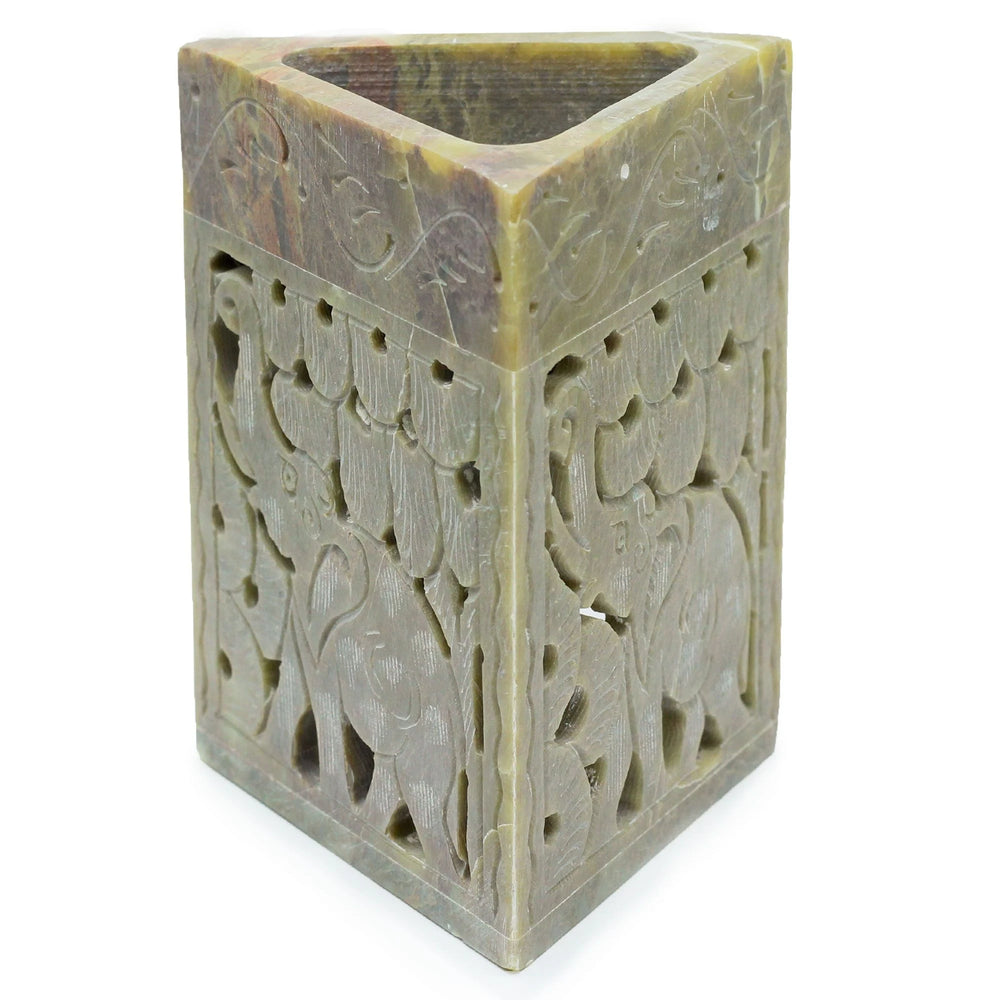 Add a unique flair to any space with this triangle-shaped soapstone oil burner, made in India. Featuring carvings of elephants, this oil burner embodies the beauty of traditional craftsmanship while delivering a functional piece for aromatherapy. Its triangular design offers a distinctive look, and the natural earthy tones of soapstone make each piece unique. Perfect for warming essential oils or wax melts, this burner combines both aesthetic appeal and practicality, creating a calming ambiance in any room.