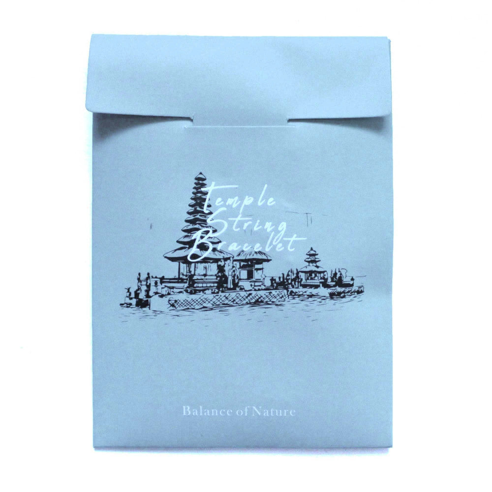 Each Temple String Bracelet - Balance of Nature is packed in a blue paper bag with a short description of its intention: