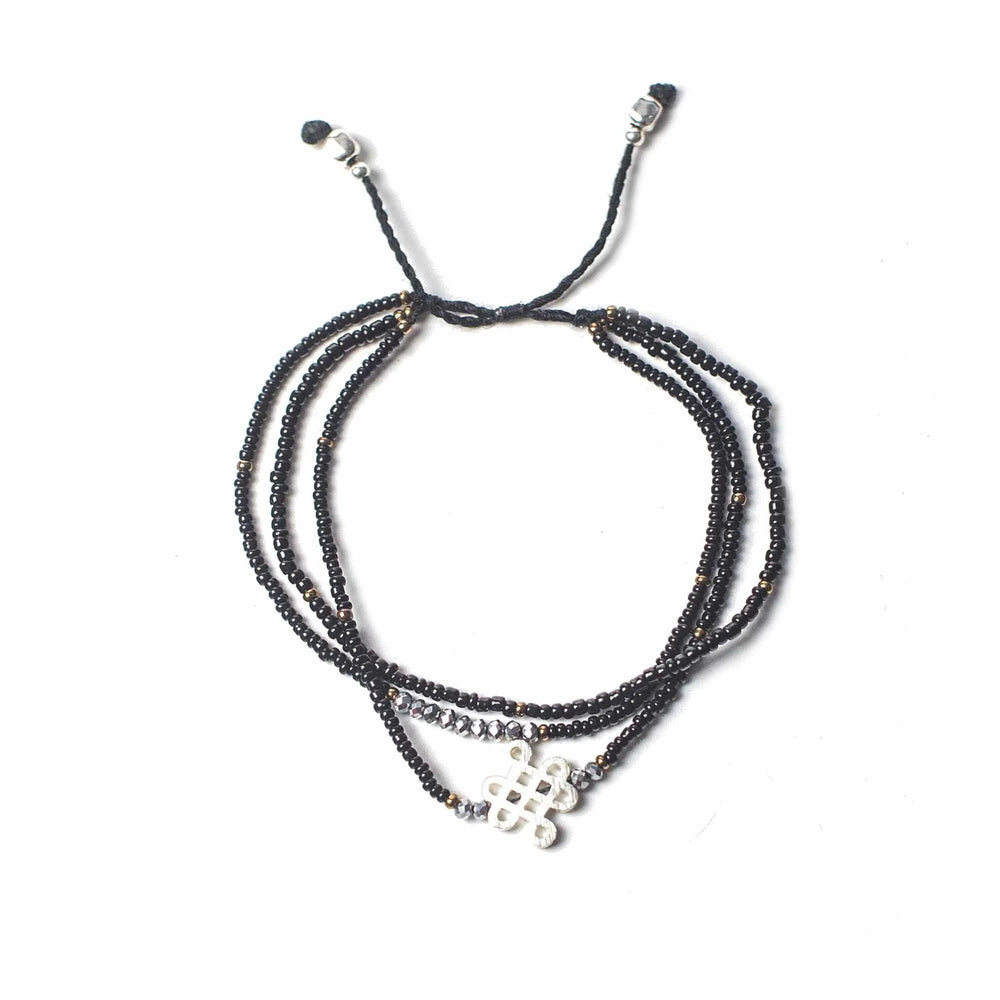 Your black string bracelet symbolizes spiritual grounding, balance and determination. You may need an invisible push, something that will keep you moving forward in life. With the help of "Spiritual Grounding" you can focus and stop negative thoughts from ruining your path to success. With the Endless Knot charm this takes on the symbol of duality and balance. Buddhism teaches that everyone should find a balance between the feminine and masculine qualities in life. This balance awakens the mind and allows one to view situations in a new light, opening you up to creativity and success.