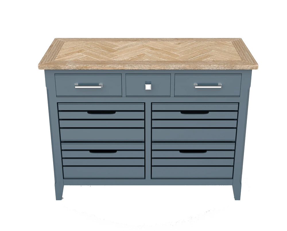 - The Signature Blue collection features meticulous craftsmanship in the hand-finishing process. The oak parquet top undergoes a delicate distressing, followed by the application of a thin layer of white paint that is meticulously hand-rubbed back. The final touch involves a resilient clear lacquer, resulting in a breathtaking and durable appearance.