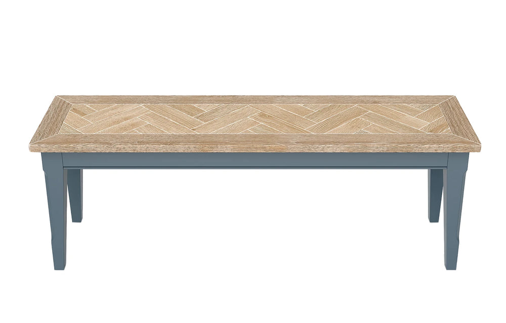 - The Signature Blue collection features meticulous craftsmanship in the hand-finishing process. The oak parquet top undergoes a delicate distressing, followed by the application of a thin layer of white paint that is meticulously hand-rubbed back. The final touch involves a resilient clear lacquer, resulting in a breathtaking and durable appearance.