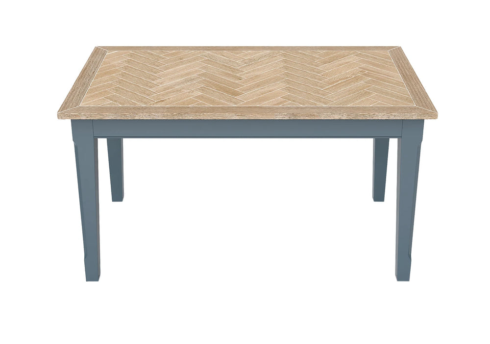 - The Signature Blue collection features meticulous craftsmanship in the hand-finishing process. The oak parquet top undergoes a delicate distressing, followed by the application of a thin layer of white paint that is meticulously hand-rubbed back. The final touch involves a resilient clear lacquer, resulting in a breathtaking and durable appearance.