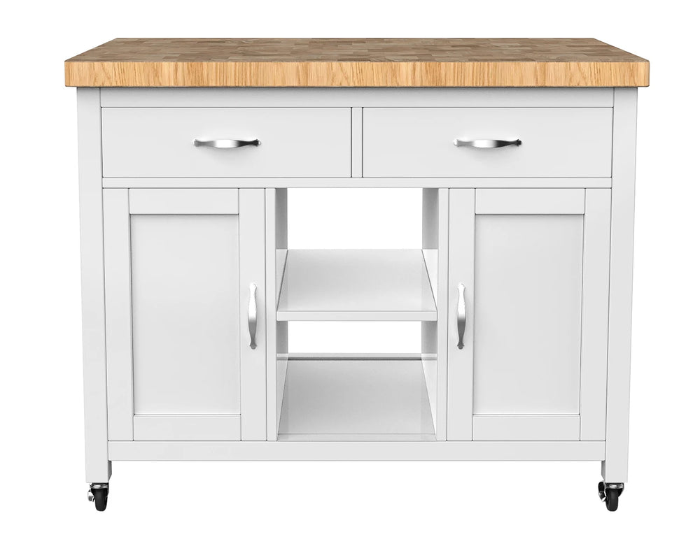 - This kitchen island is symmetrical (front and back) and features a butchers block top, braked wheels, two drawers which extend through the island, and two large storage cupboards