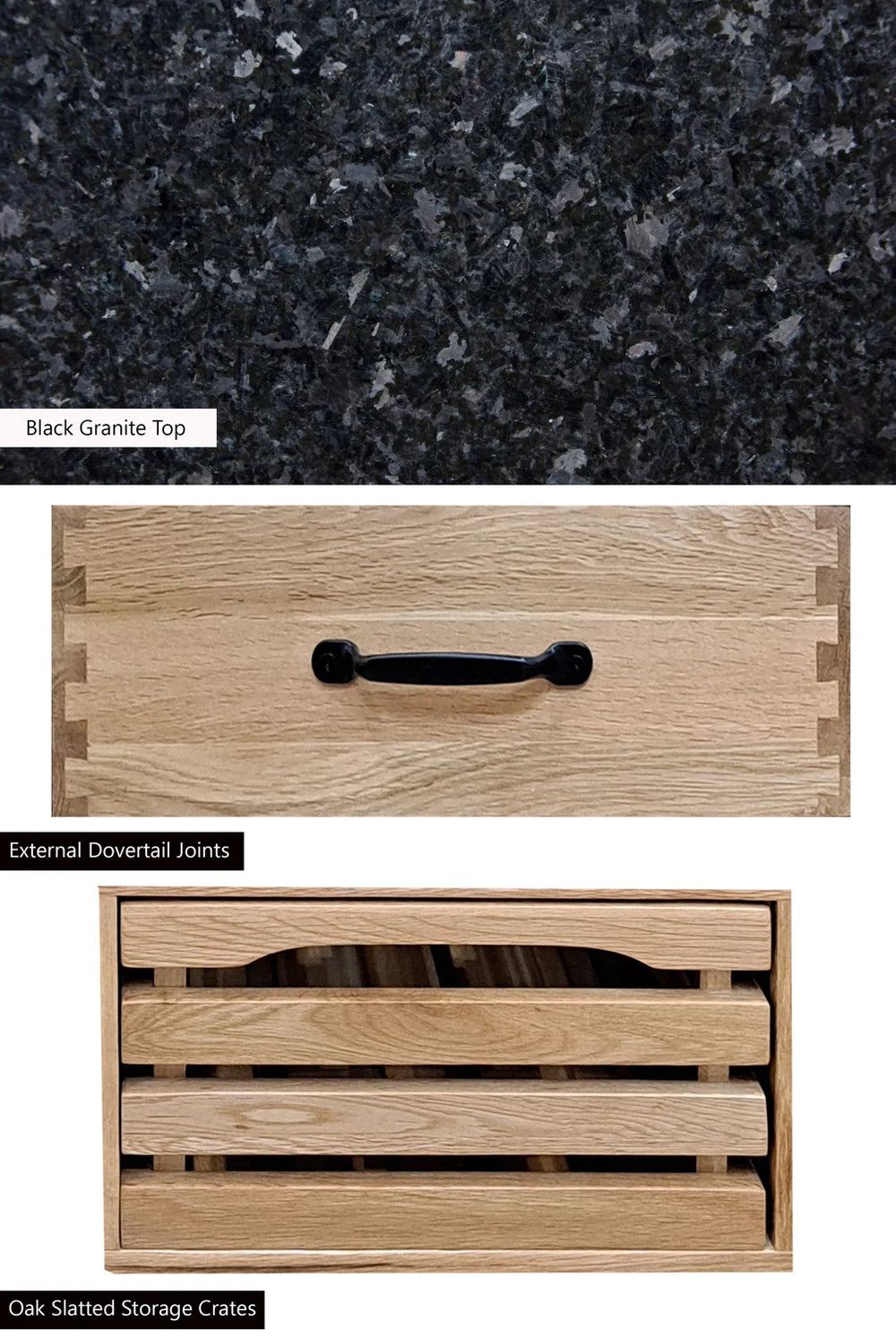 - This kitchen features a black granite top, eight externally dovetailed drawers (four each side), stylish oak storage crates and an open storage shelf