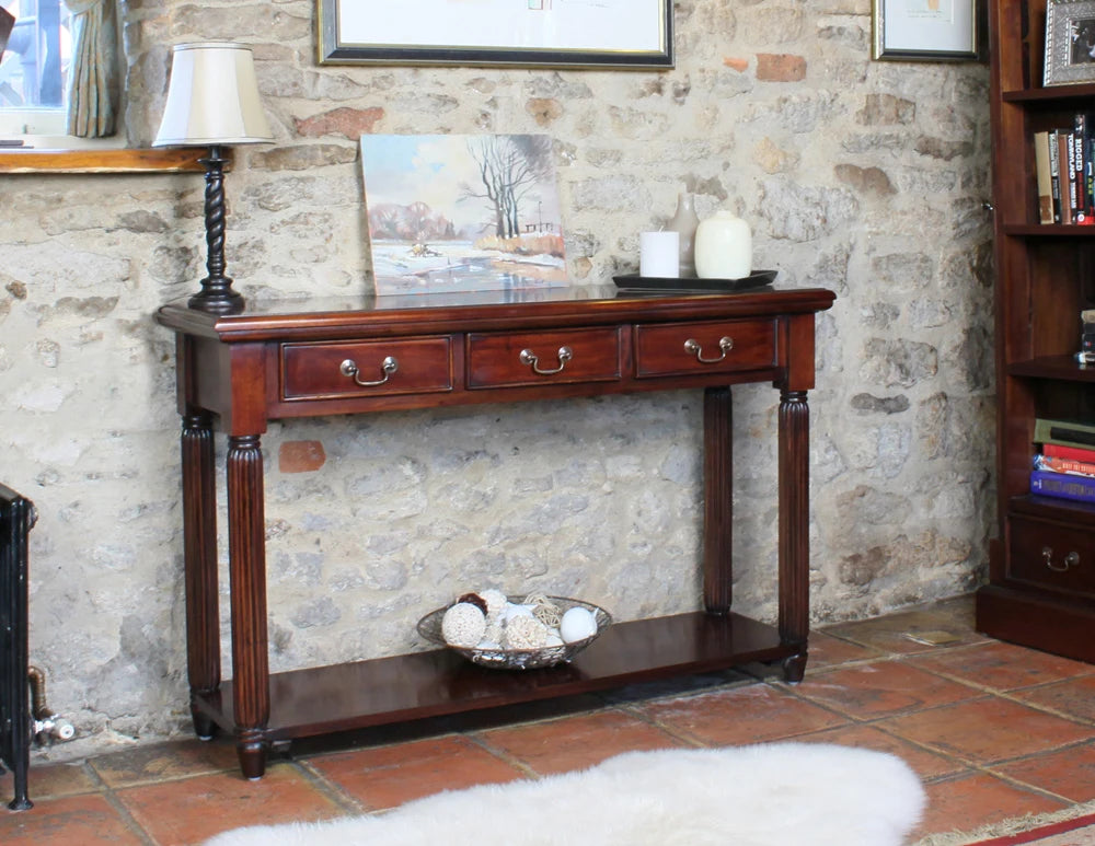 - This console table comes with three good sized drawers and a large storage shelf, it will fit well in a hallway, dining room or living room