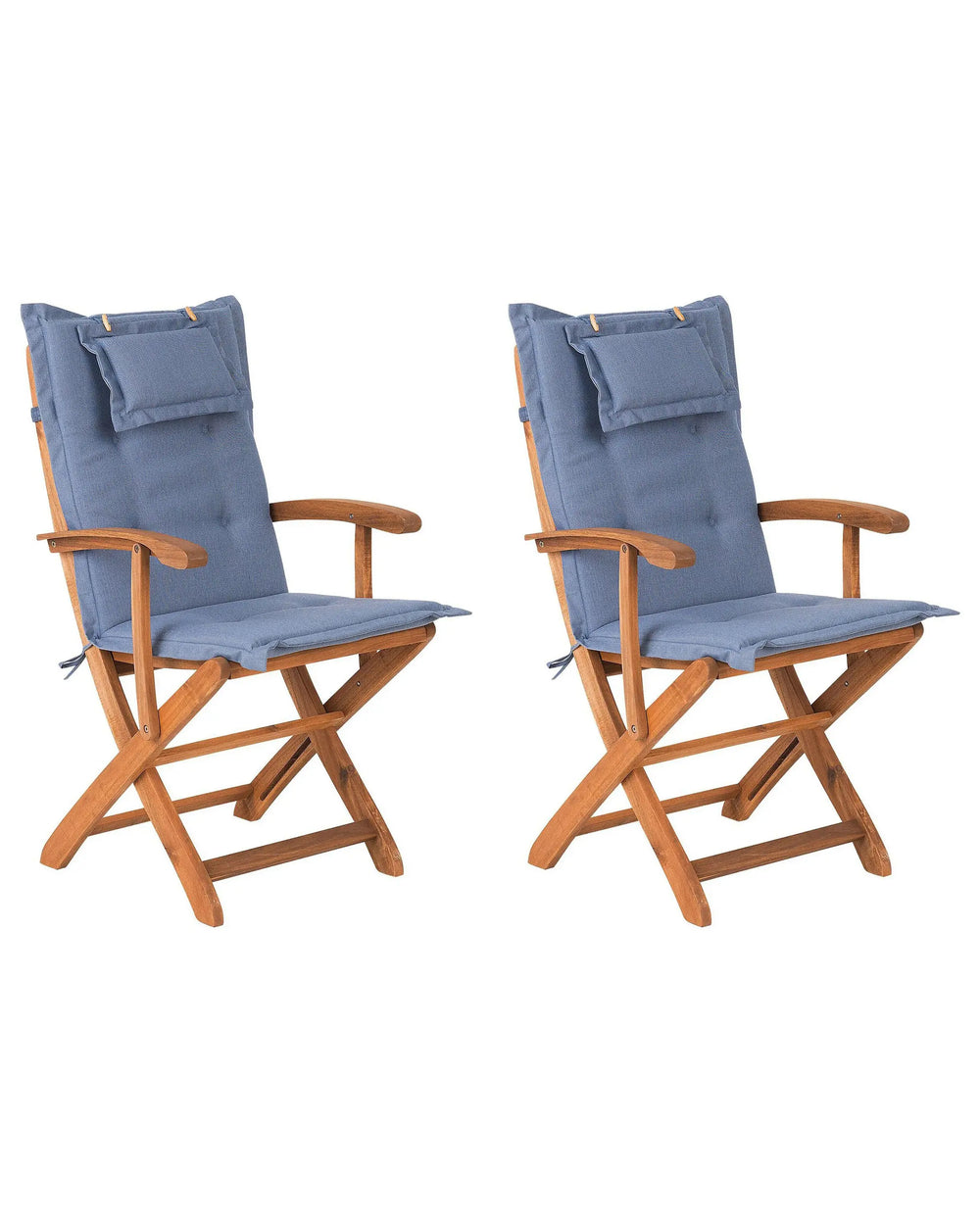Set of 2 Garden Dining Chairs Light Wood with Blue Cushion Acacia Wood Frame Folding Rustic Design Beliani