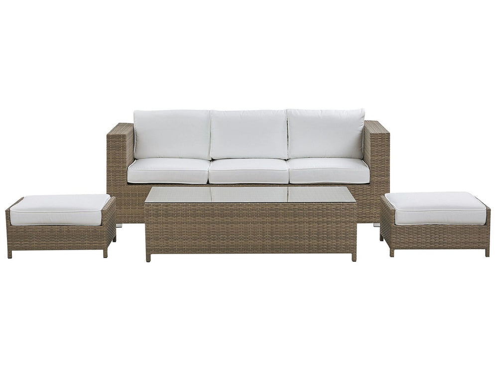 Outdoor Sofa Set Brown Faux Rattan 3 Seater Sofa with Table and 2 Ottomans White Cushions Beliani is backordered and will ship as soon as it is back in stock.