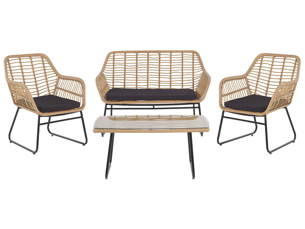 Garden Conversation Sofa Set Black Faux Rattan with Seat Pads and Coffee Table Beliani