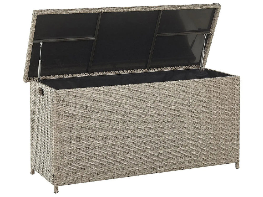 Outdoor Storage Box Beige Faux Rattan Garden Deck Cushion Chest 126 x 46 cm Beliani is backordered and will ship as soon as it is back in stock.
