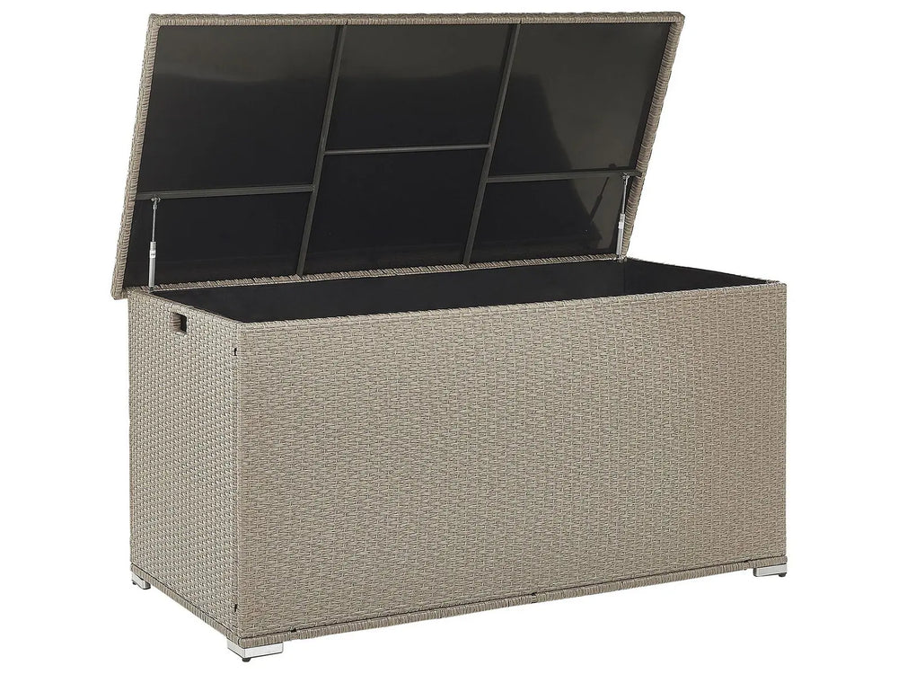 Outdoor Storage Box Beige Faux Rattan Garden Deck Cushion Chest 155 x 75 cm Beliani is backordered and will ship as soon as it is back in stock.