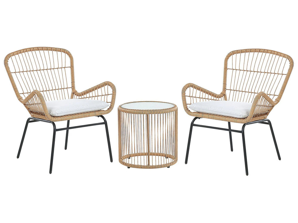 Bistro Set Brown Faux Rattan Black Steel Legs 2 Chairs with Grey Cushions Glass Table Top Modern 2 Seater Outdoor Set Beliani is backordered and will ship as soon as it is back in stock.