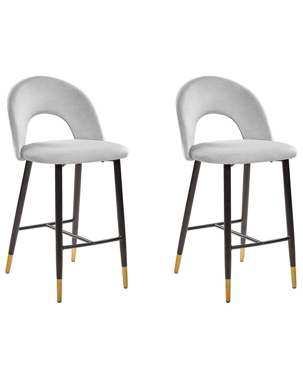 Set of 2 Bar Chairs Grey Velvet Black Steel Retro Design Golden Ends Dining Room Beliani
