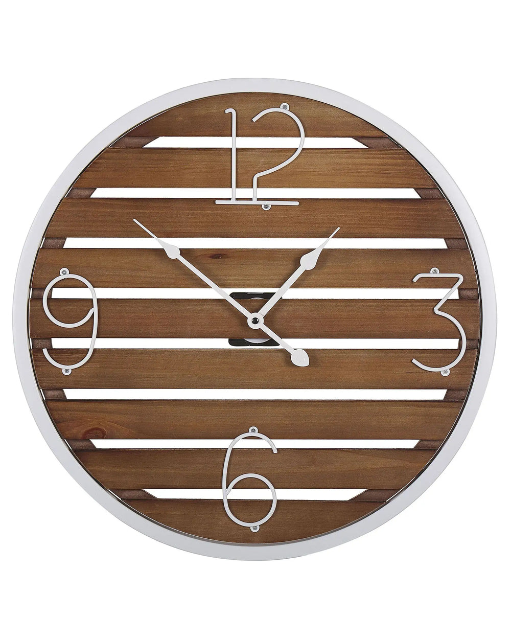 Wall Clock Dark Wood Round 50 cm Handmade Slatted Face White Metal Frame Beliani is backordered and will ship as soon as it is back in stock.