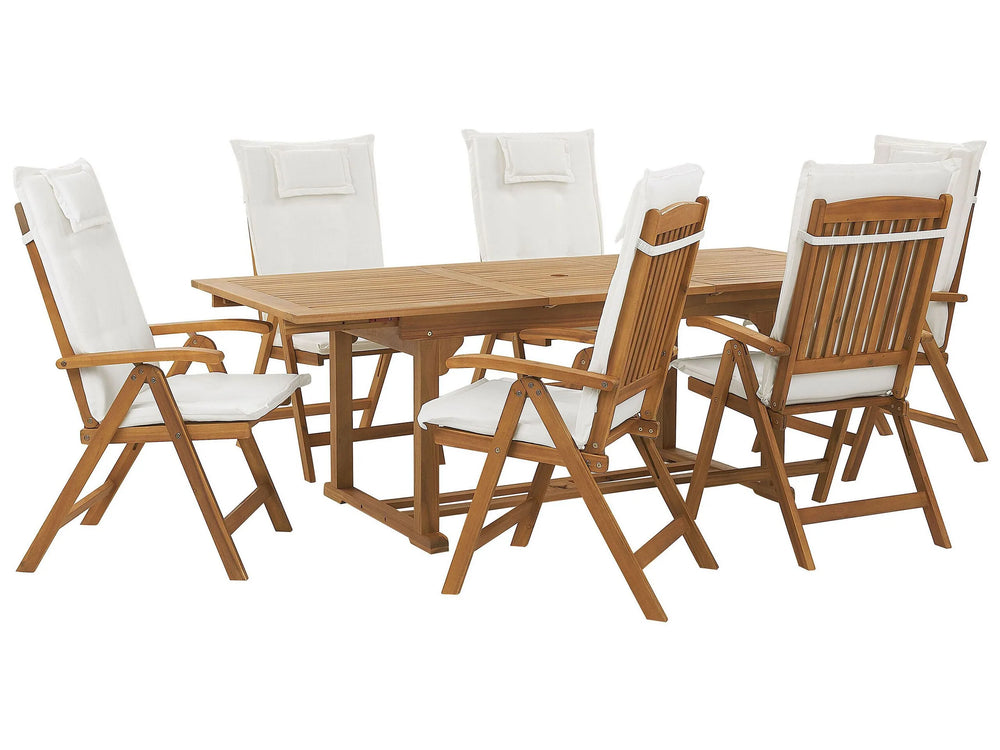 Garden Dining Set Acacia Wood with Off-White Cushions 6 Seater Adjustable Foldable Chairs Outdoor Country Style Beliani