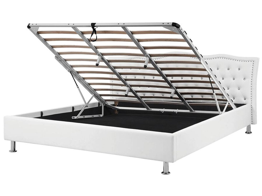 EU Super King Size Bed White Faux Leather 6ft Upholstered Frame with Storage Nailhead Trim Crystal Buttons Headrest Beliani
