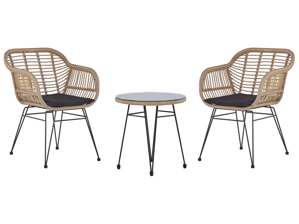 3 Piece Bistro Set Brown Faux Rattan Black Metal Hairpin Legs Glass Table Top Beliani is backordered and will ship as soon as it is back in stock.
