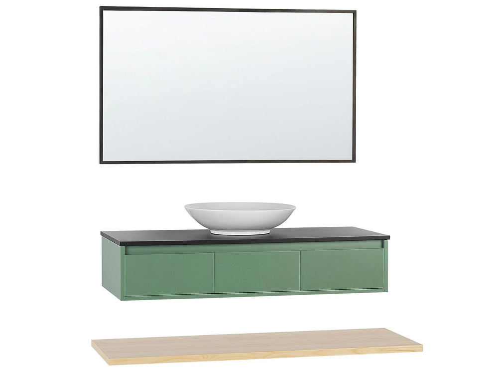 4 Piece Bathroom Furniture Set Green and Light Wood MDF with Ceramic Basin Wall Mount Vanity Cabinet with Mirror Beliani is backordered and will ship as soon as it is back in stock.