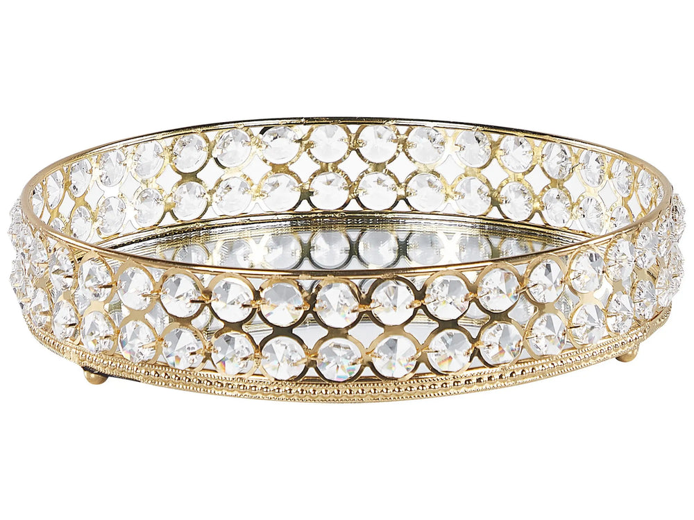 Decorative Tray Gold Iron and Glass Mirrored Round with Rhinestones Tabletop Glamour Accent Piece Beliani