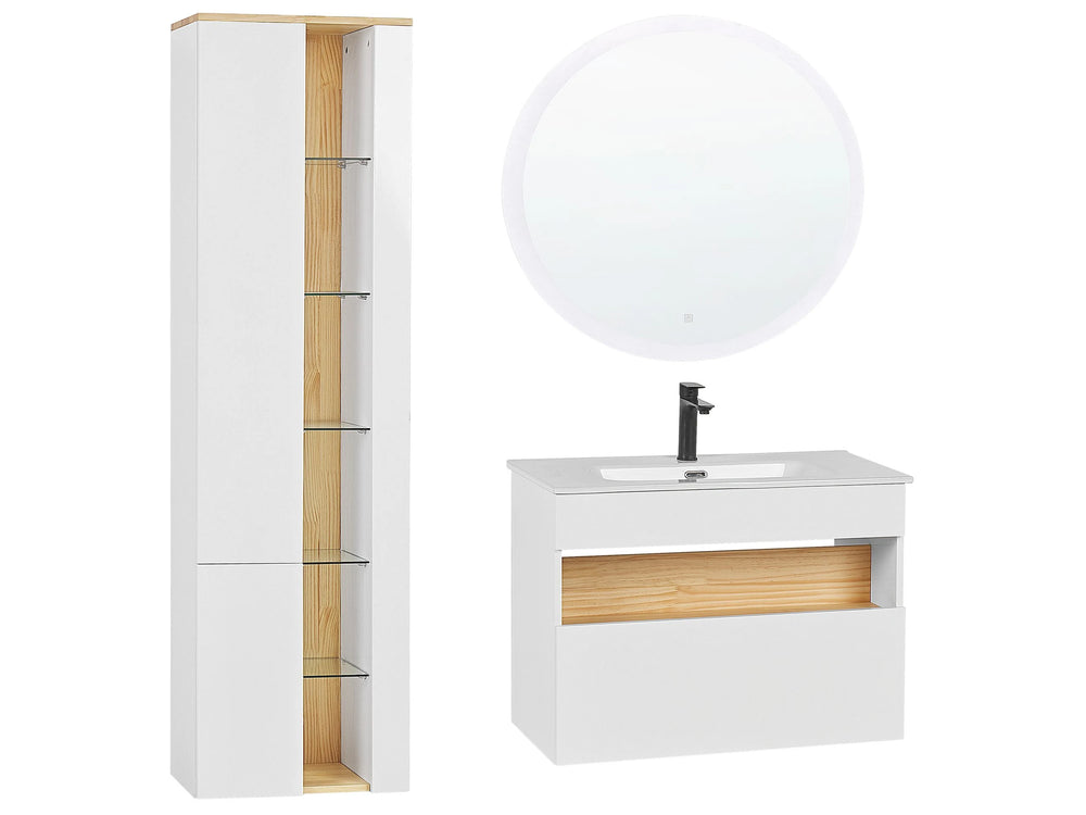 3 Piece Bathroom Furniture Set White MDF with Ceramic Basin Wall Mount Vanity Tall Cabinet Round LED Mirror Beliani is backordered and will ship as soon as it is back in stock.