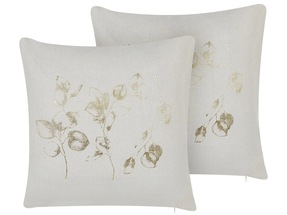 Set of 2 Cushions Off-White Polyester 45 x 45 cm Leaf Foil Print with Filling Zipper Scatter Throw Pillow Beliani