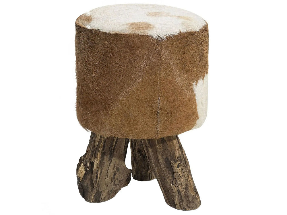 Footstool Goat Leather Teak Wood Tripod Legs Cow Pattern Rustic Style Beliani