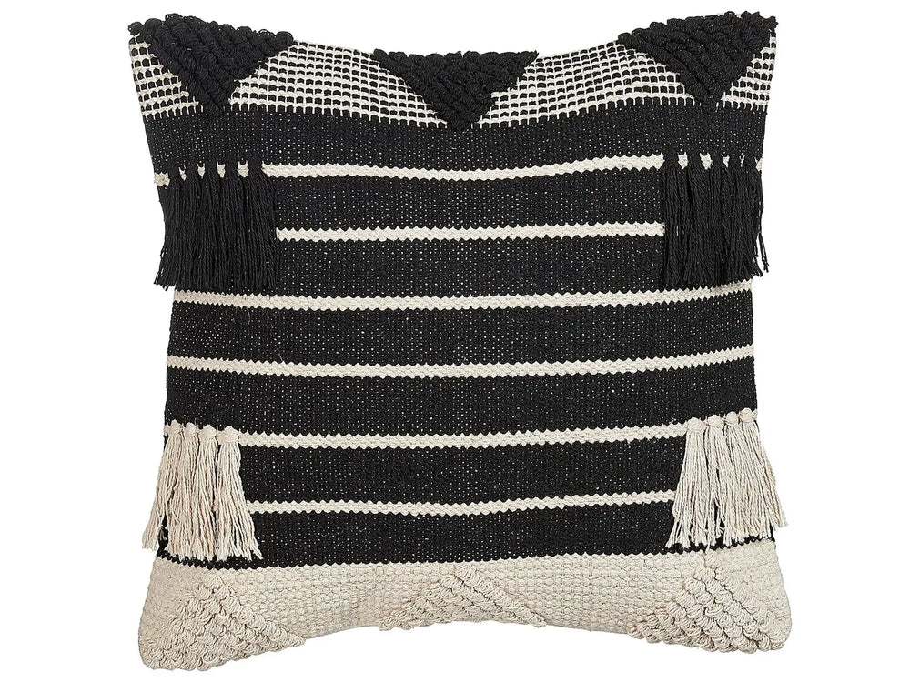 Scatter Cushion Beige and Black Cotton 50 x 50 cm Geometric Pattern Tassels Handwoven Removable Cover with Filling Beliani is backordered and will ship as soon as it is back in stock.
