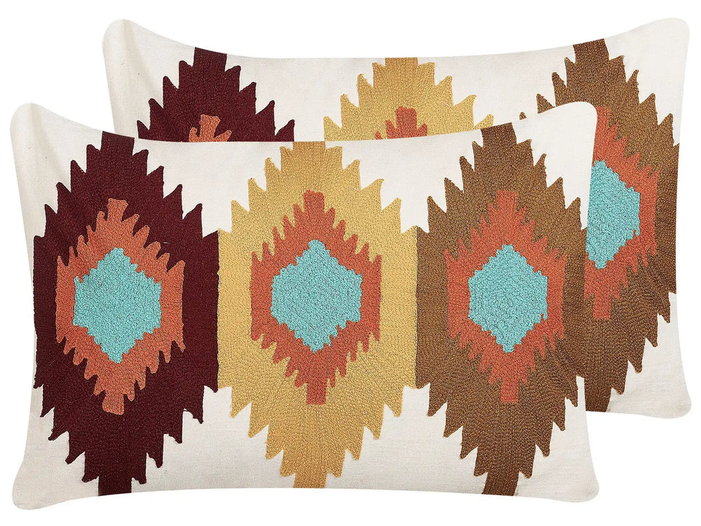 Set of 2 Scatter Cushions Multicolour Cotton Wool 40 x 60 cm Geometric Pattern Handmade Embroidered Removable Cover with Filling Boho Style Beliani