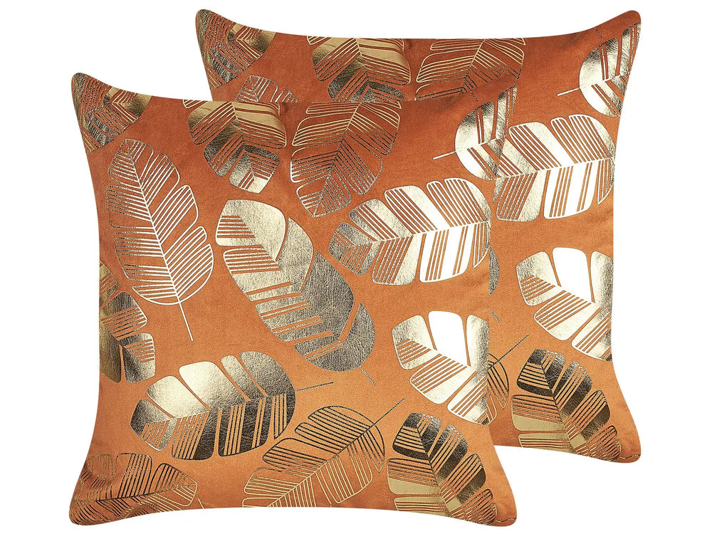 Set of 2 Decorative Cushions Orange Velvet 45 x 45 cm Gold Leaf Foil Print Glamour Decor Accessories Beliani