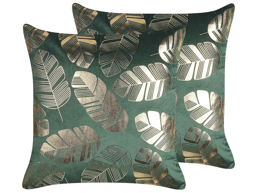 Set of 2 Decorative Cushions Green Velvet 45 x 45 cm Gold Leaf Foil Print Glamour Decor Accessories Beliani