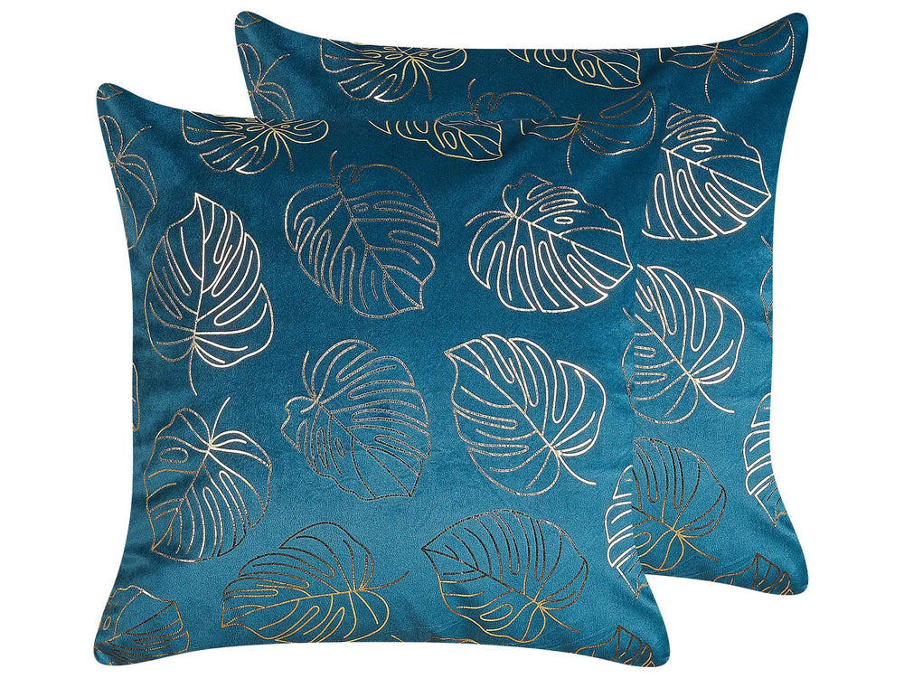 Set of 2 Decorative Cushions Blue Velvet 45 x 45 cm Leaf Print Glamour Decor Accessories Beliani