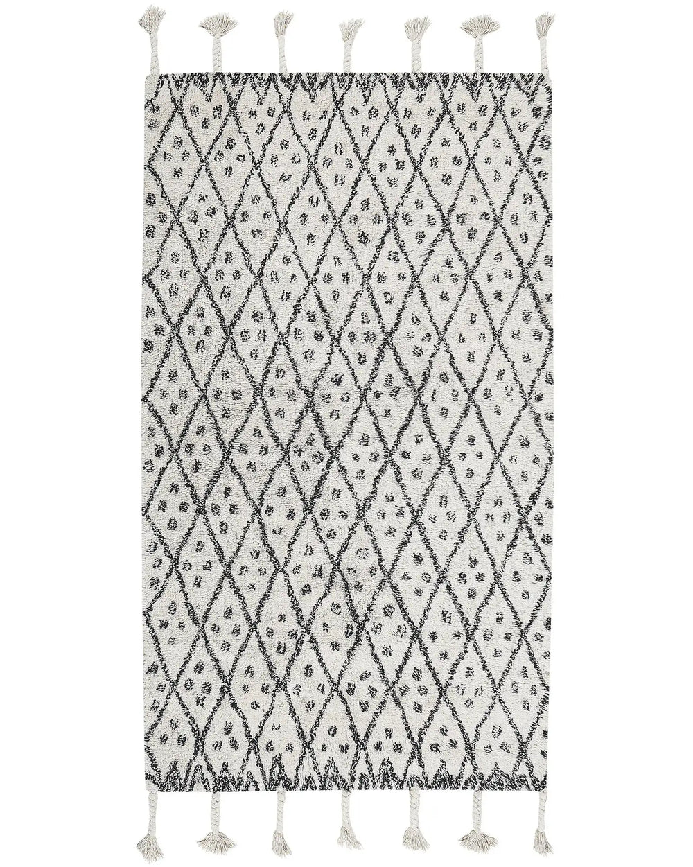 Rug Off-White Black Cotton 80 x 150 cm Geometric Pattern Runes Tribal Tassels Oriental Beliani