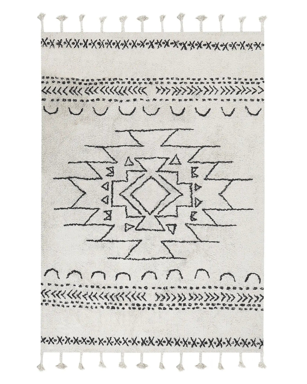 Rug Off-White Black Cotton 140 x 200 cm Geometric Pattern Runes Tribal Tassels Oriental Beliani