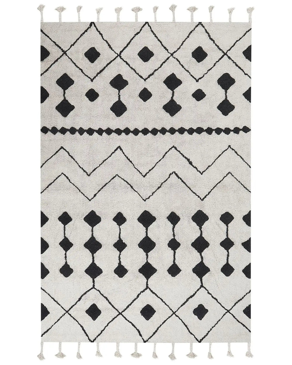 Rug Off-White Black Cotton 160 x 230 cm Geometric Pattern Runes Tribal Tassels Oriental Beliani is backordered and will ship as soon as it is back in stock.