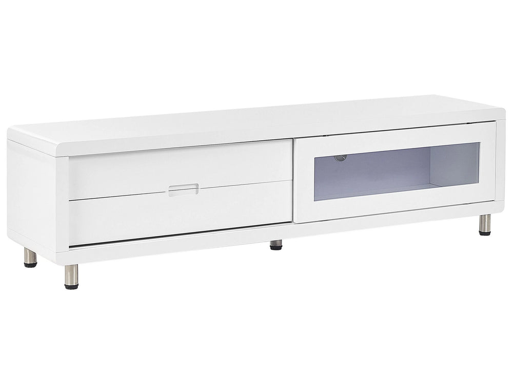 TV Stand White MDF High Gloss Cabinet with Sliding Door 2 Drawers Minimalistic Beliani