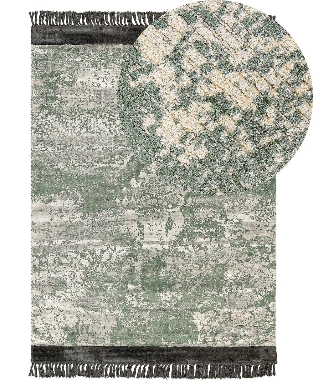 Area Rug Green and Beige Viscose with Cotton Backing with Fringes 140 x 200 cm Style Vintage Distressed Pattern Beliani