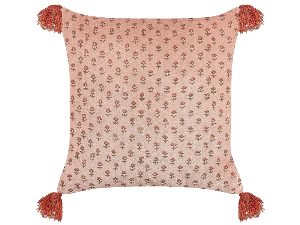 Decorative Cushion Pink Velvet and Cotton 45 x 45 cm Floral Pattern Block Printed Boho Decor Accessories Beliani