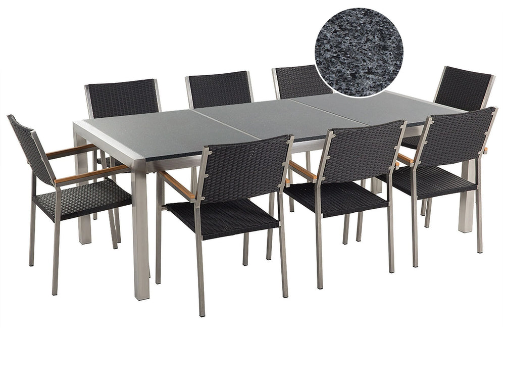 Garden Dining Set Black with Grey Granite Table Top Rattan Chairs 8 Seats 220 x 100 cm Beliani is backordered and will ship as soon as it is back in stock.