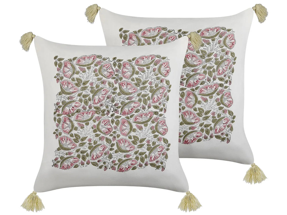 Set of 2 Scatter Cushions Multicolour Cotton 45 x 45 cm Floral Pattern Tassels Handmade Removable Cover with Filling Boho Style Beliani