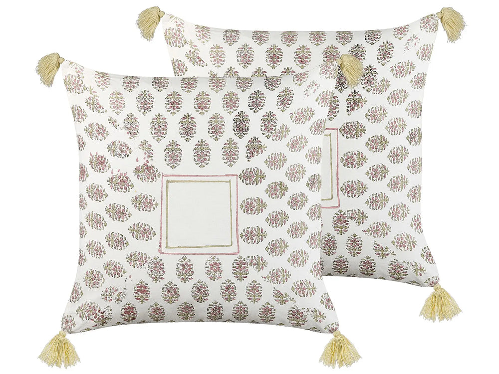 Set of 2 Scatter Cushions Multicolour Cotton 45 x 45 cm Geometric Pattern Tassels Handmade Removable Cover with Filling Boho Style Beliani is backordered and will ship as soon as it is back in stock.